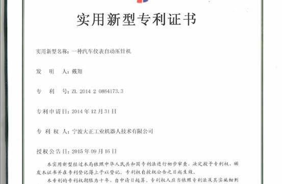近日,寧波大正工業(yè)機(jī)器人技術(shù)有限公司憑借一種汽車(chē)儀表自動(dòng)壓針機(jī)(專(zhuān)利號(hào):ZL 2014 2 0864173.3);一種汽車(chē)儀表自動(dòng)壓針系統(tǒng)(專(zhuān)利號(hào)ZL 2014 2 0863870.7);一種汽車(chē)儀表自動(dòng)壓針裝置(專(zhuān)利號(hào):ZL 2014 2 0863918.4)三項(xiàng)技術(shù)榮獲“實(shí)用新型專(zhuān)利證書(shū)”。
